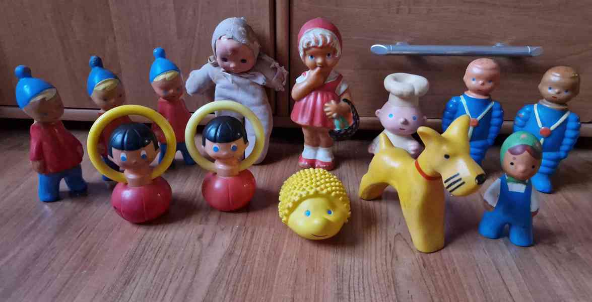 Dále prodám sběratelům starých hraček ,nebo pro vzpomínku na mládí těchto 13 starých pískacích dětských hraček od Libuše Niklové.Jedná se o tři panáčky Rýša,panenku se zeleným šátkem,2x parašutista,kuchaře,žlutého ježečka,2xcibuláček(cvičenec),hadrová panenka s modrýma očima (už něco pamatuje,trochu vzadu sešitá,ale je), Gumová karkulka s košíčkem a pejska.Docela zachovalé kousky, stav viz,. foto - pískátka funkční,jen kuchař, jeden paragán a jeden Rýša ho nemá.Třeba někdo využije.