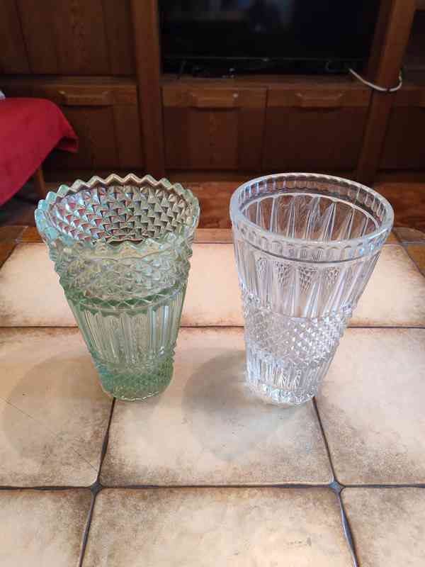 Prodám retro vázy z lisovaného skla 2 ks. Cca 70-80 léta. V perfektním stavu. K nim zdarma kompletní sada retro bulharského porcelánu ze stejné doby (vyklízím nemovitost, zbavuji se věcí).