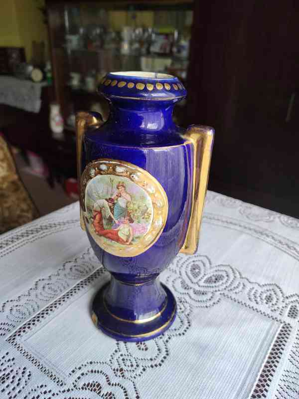 Prodám starožitnou vázu z glazovaného porcelánu s kobaltově modrým podkladem a zlacenými detaily v předu zdobenou výjevem tři grácie. Výška 23 cm. Na dně značka výrobce (možná značka Vídně). Celkově v dobrém stavu odpovídajícímu stáří. K váze přidám zdarma mosazný pocínovaný svícen zhruba za stejné doby - polovina 19 století (vyklízím starou nemovitost, zbavuji se věcí).