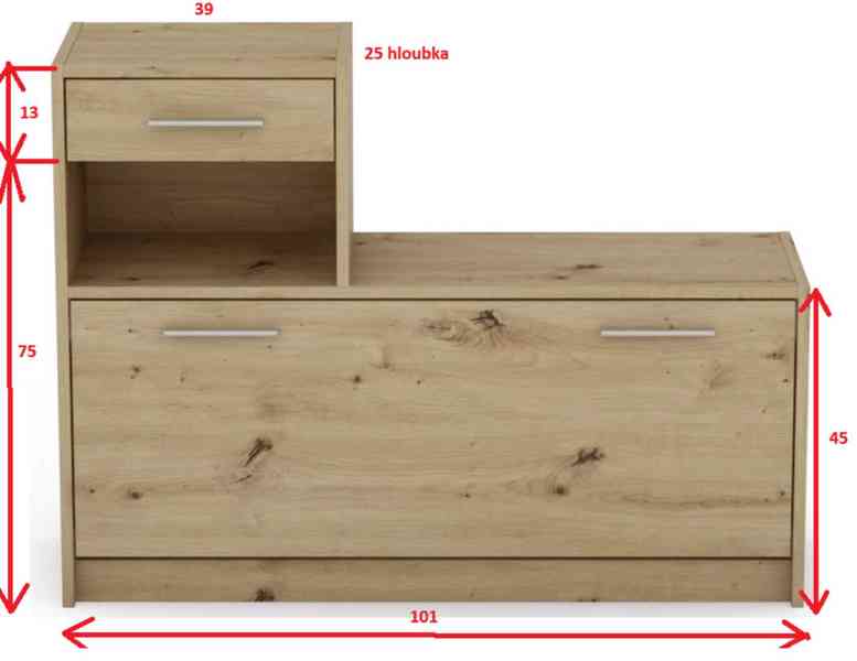 Botníková skříňka: dolní výklopná skříňka (uvnitř přihrádka na boty, až pro 8 párů bot, 1 x šuplík, rozměry viz obrázek.