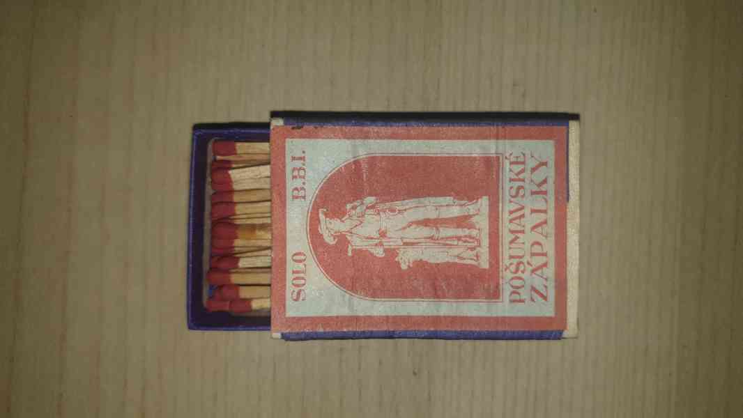Stará dýhovaná krabička. Nepoužitá, se zápalkami. Krabička není plná.