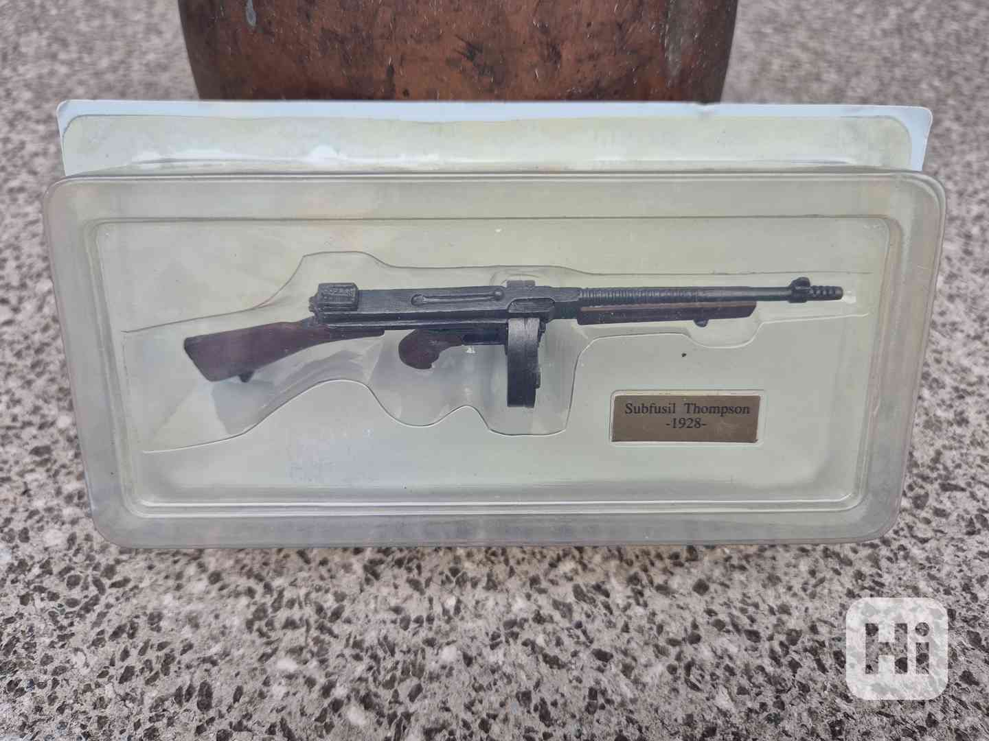 Kovový model (miniatura) amerického samopalu Subfusil Thompson 1928 M1, v originálním blistru, dřevo/kov, cca 13cm.