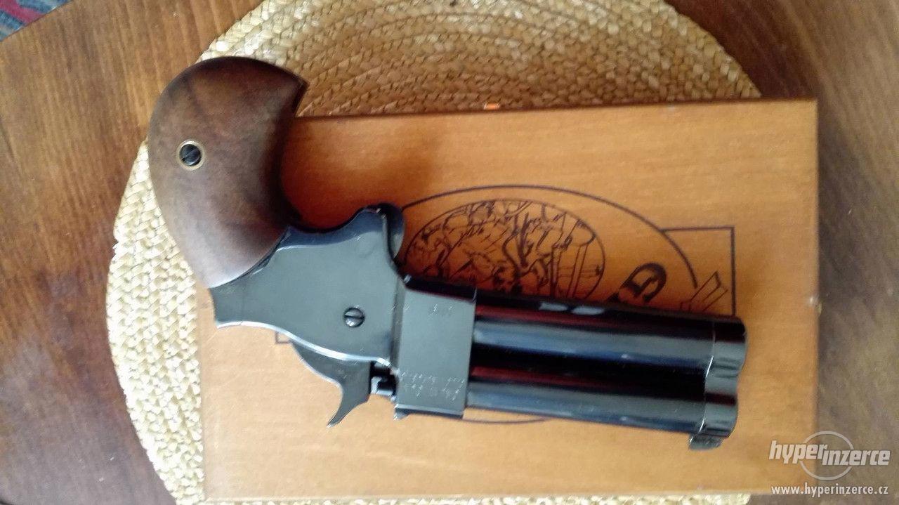 Perkusní dvouhlavňová pistole Great Gun Derringer .45 o délce hlavní 4,5". Tato zbraň je volně prodejná od 18 let (zbraň kategorie D), nepodléhá registraci a není nutný zbrojní průkaz.Zbraň je úplně nová (nikdy se nestřílelo). Původní cena 7000,- Kč.