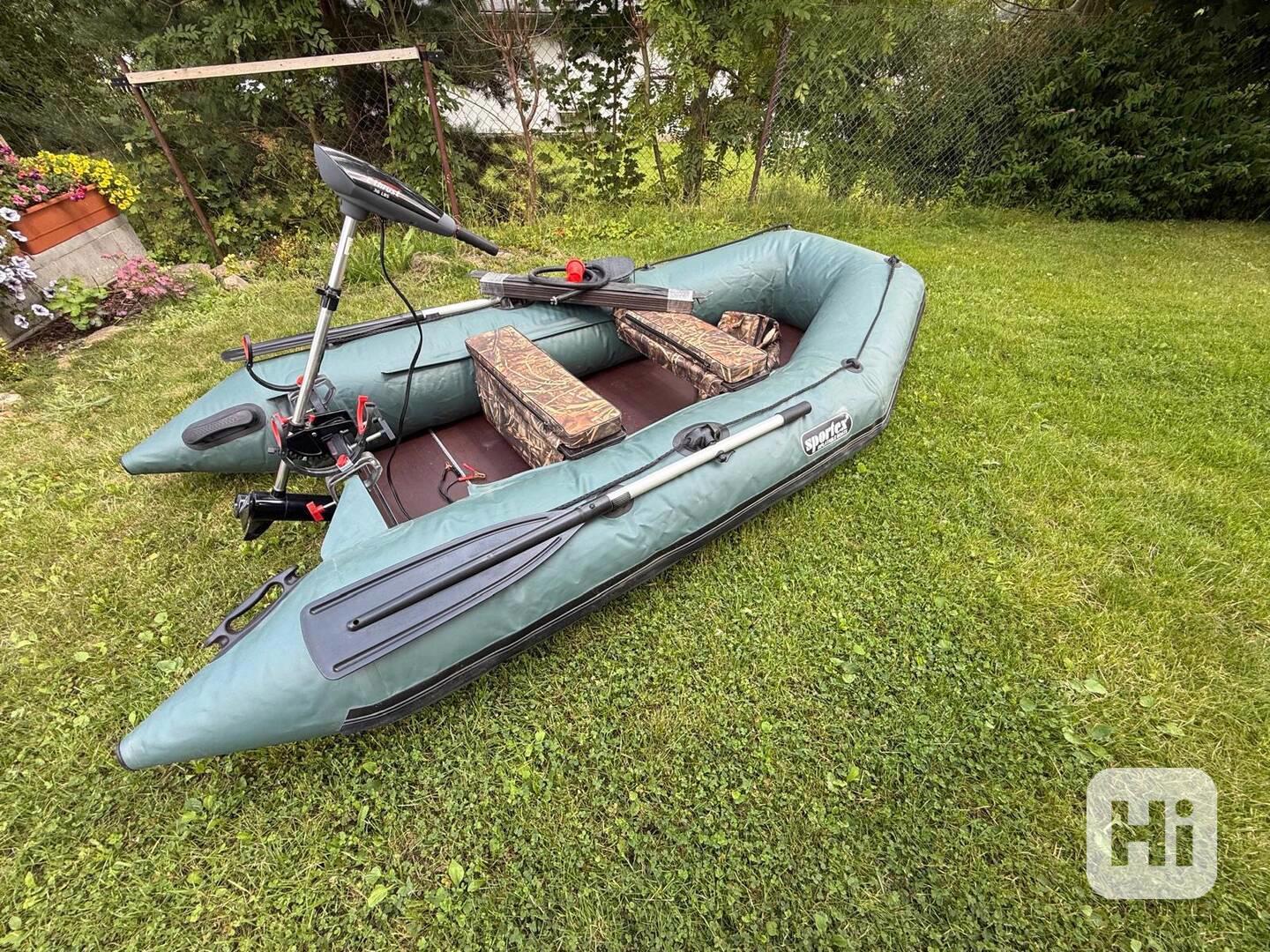 Prodám nafukovací člun délka 290cm. S pevným zadním čelem k uchycení motoru. Člun byl na vodě jen párkrát (nebyl čas). Obsah: pumpa, 2x vesla, sada na opravu, přepravní taška, lamelová podlaha. Přidám dodělanou pevnou odlehčenou podlahu po celé délce člunu. K člunu je i motor E thrust 36LBS (bez baterie). Motor má 5 rychlostí vpřed a 2 rychlosti vzad. Dále přidám 2x přídavná taška s podsedáky, 2x držák prutů. Vše jak vidíte na fotu. Osobní odběr.
