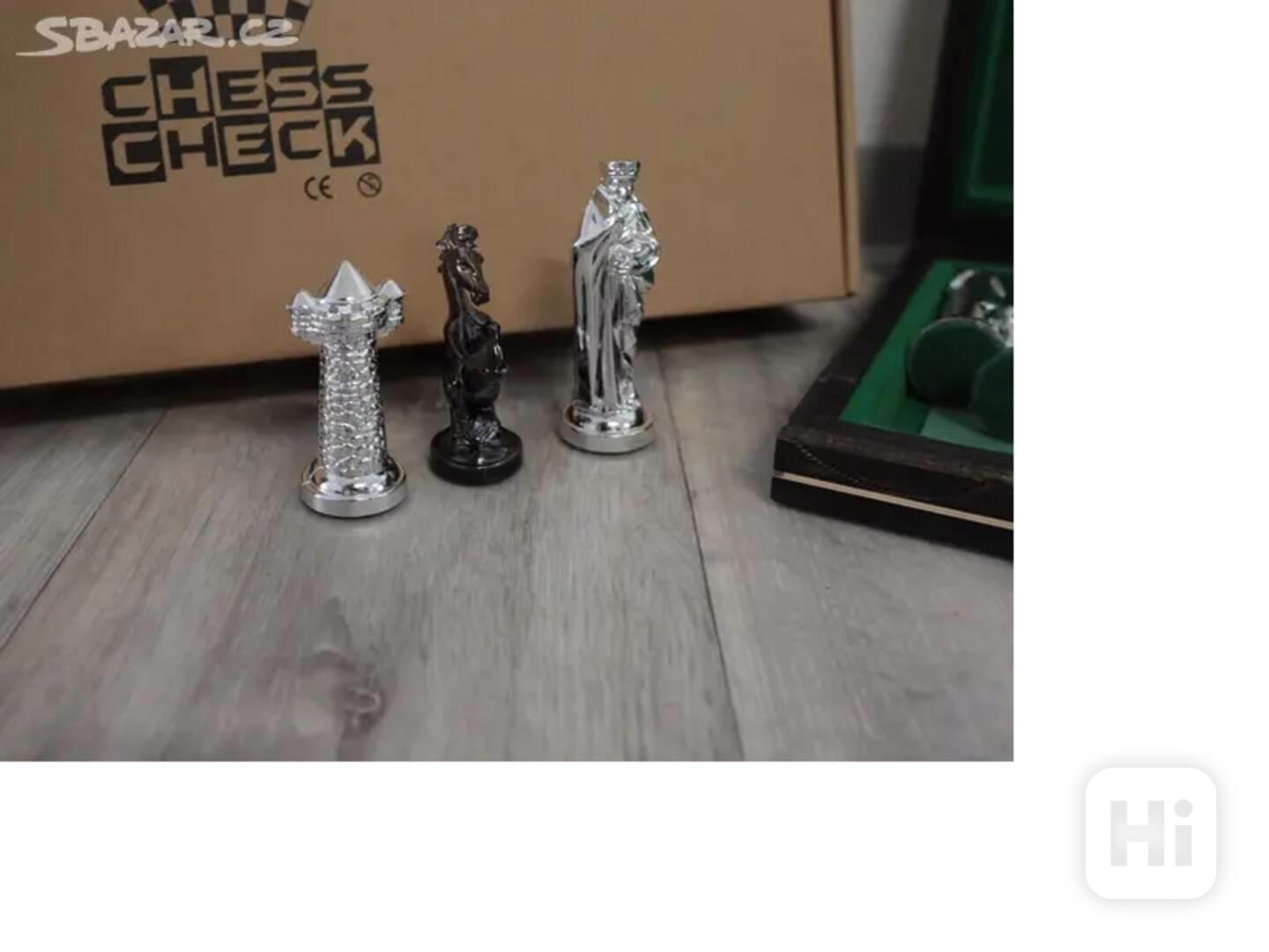 Středověké šachy stříbrné nebo zlaté a černé metalizované. Základním materiálem kazety je smrkové dřevo a překližka. Rozložená šachovnice má rozměry 42x42x2,5 cm, po složení je to krabice, do které lze uložit šachové figurky. Šachové figurky jsou vyrobeny z plastu, potažené zlatou nebo stříbrnou a černou metalizovanou barvou. Zobrazují středověké postavy a budovy. Ve spodní části každé figury je závaží, které stabilizuje figurky a vypadá, jako by byla celá z kovu, když vezmete figurku do ruky.