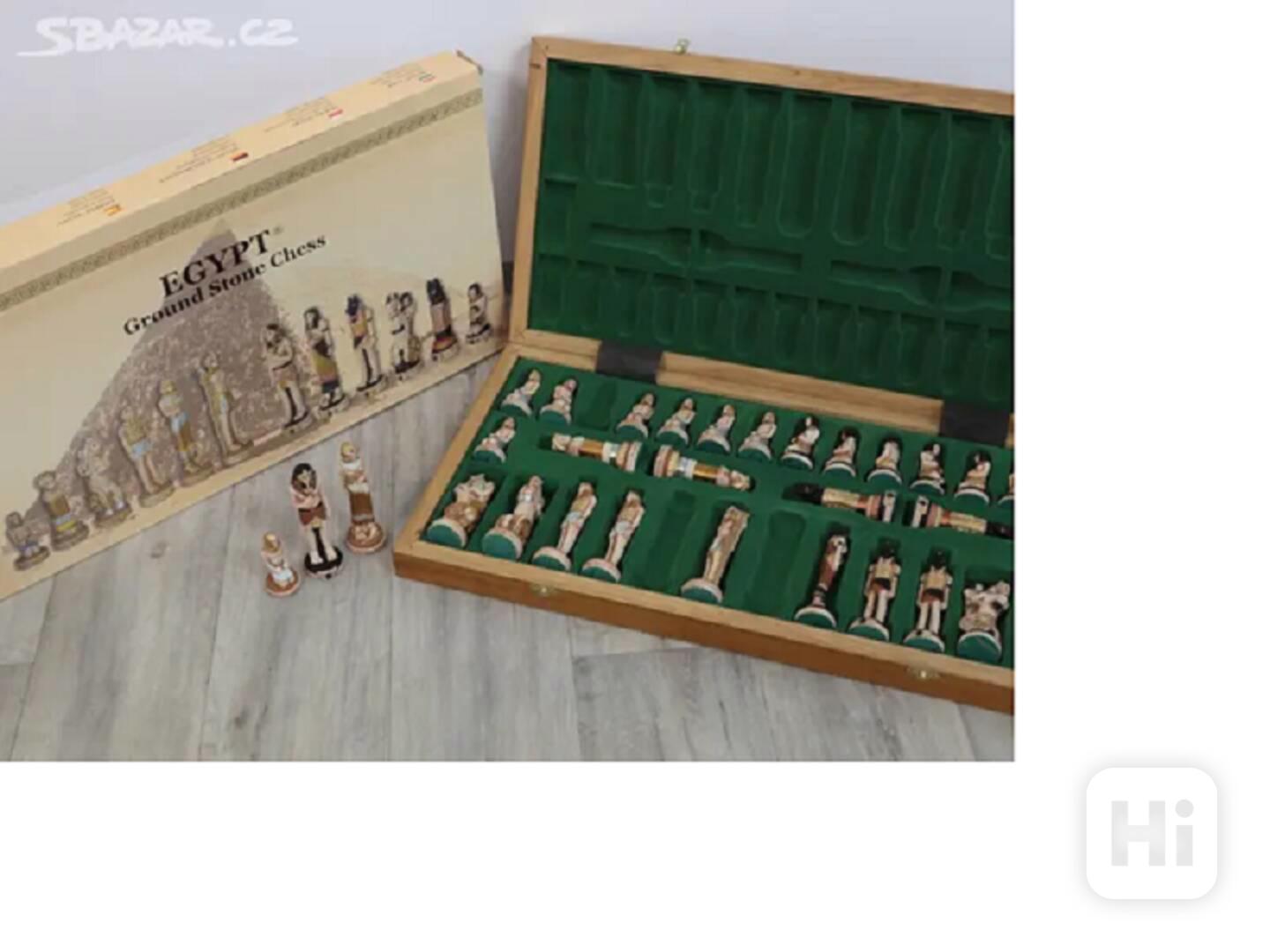 Luxusní šachy EGYPT 157 mad zhotovené z malované pryskyřice. Rozměr šachovnice rozložené 650 x 650 x 35 mm, ve složeném stavu rozměr šachovnice 650 x 325 x 70 mm. Výška figurky krále u dřevěných vyřezávaných šach 230 mm.
