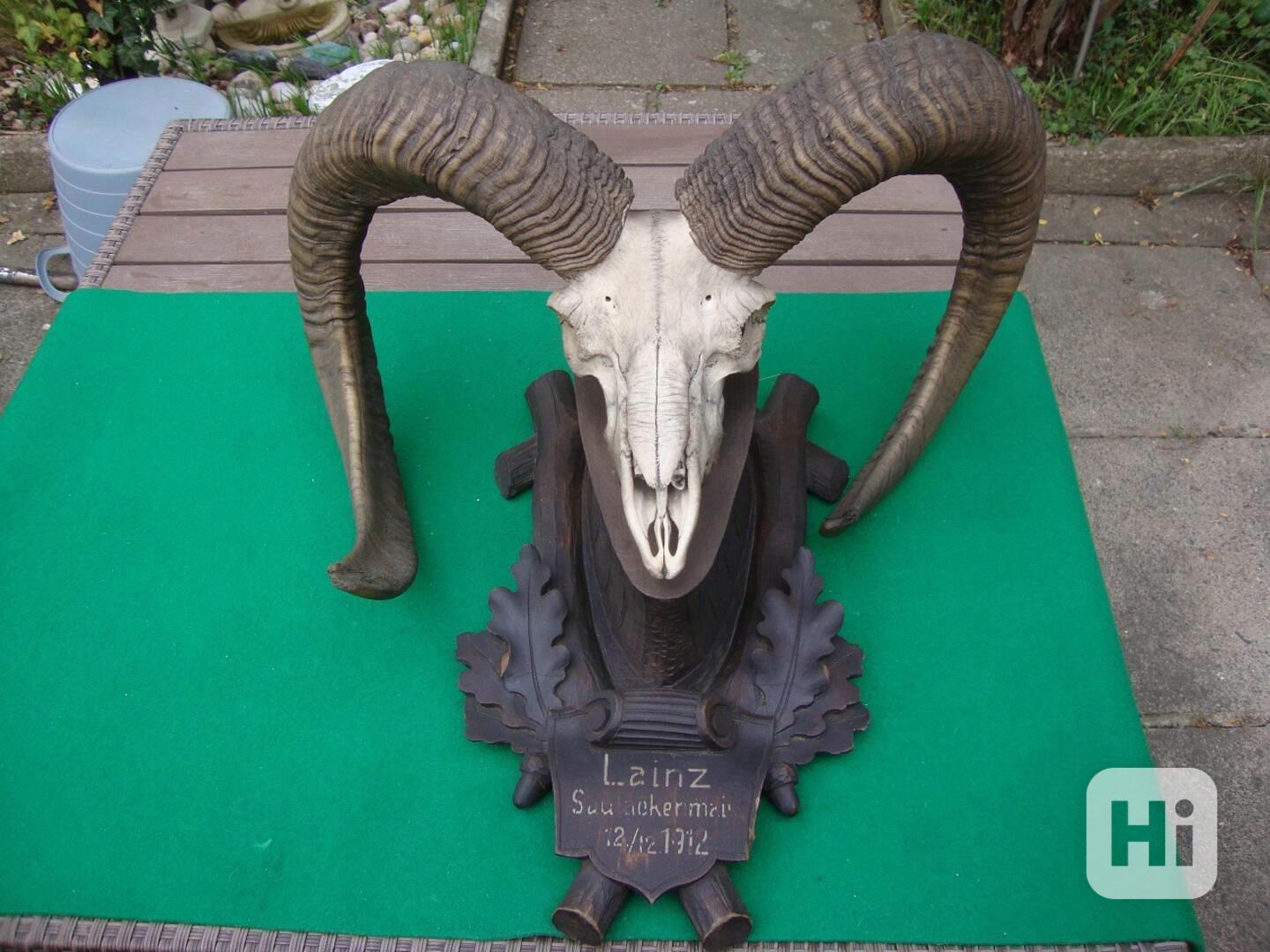 Prodám tuto krásnou, starožitnou Mufloní trofej. Datována 12.12. 1912 Lainz , což byla Císařská obora u Vídně z dob Rakouska-Uherska. Krásně vyřezávaná, starožitná deska, trofej zachovalá. Průměr parohů u lebky 22 cm a délka parohu měřeno krejčovským metrem z vnější strany parohu jeden cca 61 cm a druhý cca 64 cm. Krásná,starožitná, sběratelská trofej z významné lovecké lokality z doby Rakouska-Uherska. Ojedinělá možnost k sehnání do sbírky.